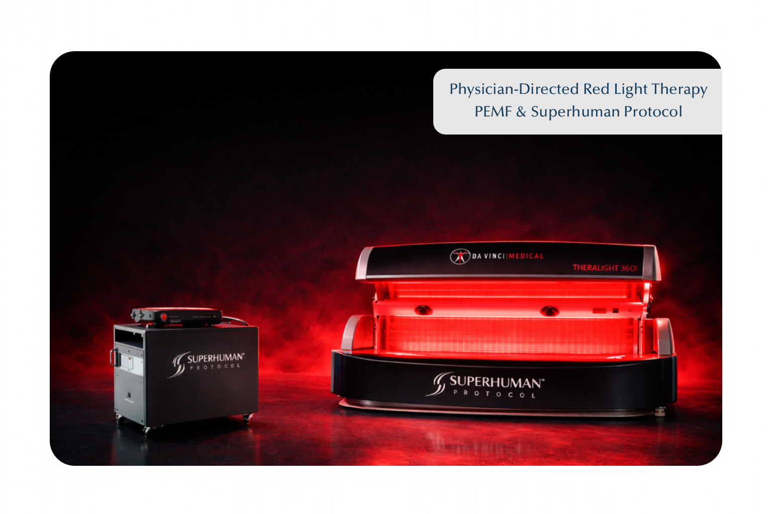 Physician-directed photobiomodulation with optional PEMF and Superhuman Protocol delivered in a structured clinical setting.